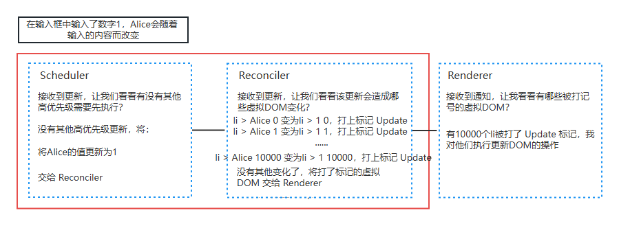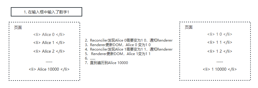 Reconciler和Renderer是交替工作的,当第一个li在页面上已经变化后,第二个li再进入Reconciler。 由于整个过程都是同步的,所以在用户看来所有DOM是同时更新的,但更新过程中,用户继续输入2,就不会马上响应,需要等到更完成后输入框中才能出现2。