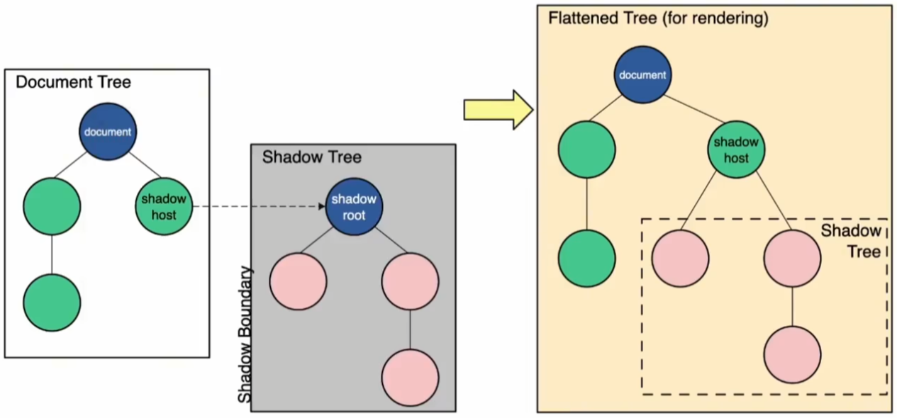 shadow dom可以构造一颗独立的dom树,被成为shadow tree 与全局的dom tree相互隔离,它需要挂载到dom树的一个节点上
